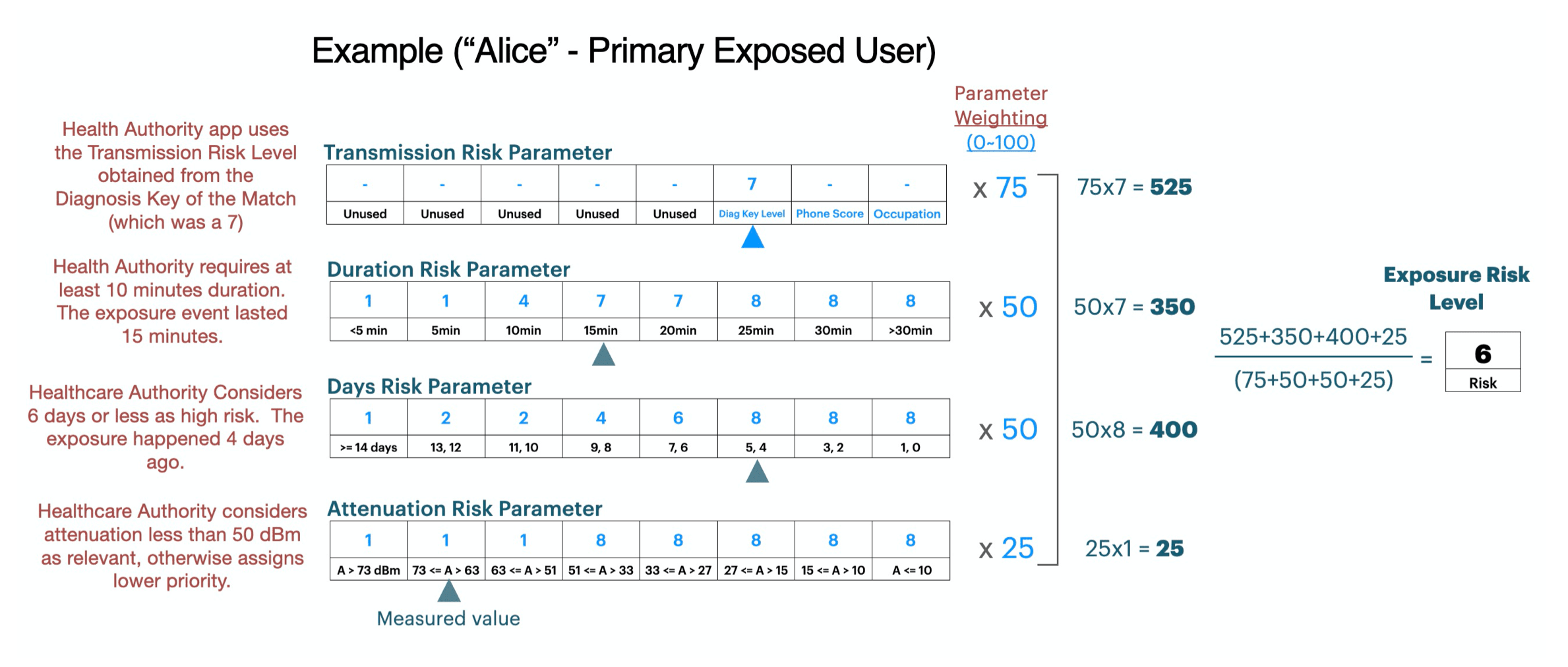 - Transmission risk, which is an app-definied value that may be based on symptoms, level of diagnosis verification, or other determination from the app or a health authority